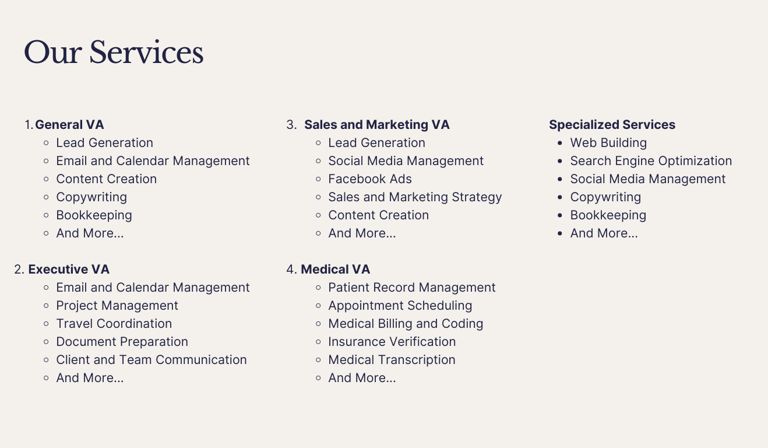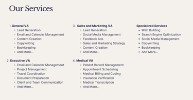 We are committed to delivering exceptional support with our comprehensive Virtual Assistant services, tailored to meet the unique needs of your business. Whether you need administrative help, expertise in sales and marketing, or specialized skills, our professional VAs are here to empower your growth and success.